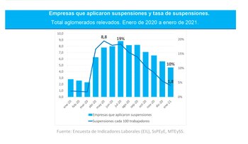 Según la EIL, “el porcentaje de empleos suspendidos pasó del 8,8% en mayo de 2020 a 1,8% en enero de 2021 (una caída de 7 puntos porcentuales en ocho meses). No obstante, la incidencia de las suspensiones en el empleo registrado privado sigue siendo elevada con relación a la serie histórica. Desde la perspectiva de las empresas, en enero de 2021, el 10% las empresas aplicaron suspensiones, duplicando también los valores históricos”.
