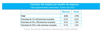 Pero como en el caso sectorial, en términos interanuales, todos los tamaños de empresas presentaron todavía disminución del empleo registrado, siendo las más pequeñas las que más perdieron.