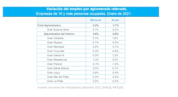 La EIL también detectó que “en enero de 2021, todos los sectores de actividad, a excepción de los servicios sociales y personales (-0,2%), aumentaron las dotaciones de personal, destacándose el crecimiento del empleo en la construcción, que ascendió al 1,7% en el total de aglomerados relevados (aunque se estima que una porción acotada de esta expansión obedece a la presencia de factores estacionales)”, que provoca la disminución en diciembre, para poder cobrar un bono por desempleo. “El comercio tuvo un incremento del 0,3%, mientras que la industria y los servicios financieros y a las empresas mostraron una expansión del empleo del 0,2% y el transporte del 0,1 por ciento”, completa el análisis oficial.