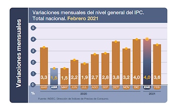 La inflación acumulada de los primeros dos meses del año es de 7,8%, mientras que la interanual marcó una aceleración considerable, de 38,5% en enero a 40,7% en febrero, lo que se explica por el índice que hubo en ese mismo mes de 2020, cuando fue de 2%.