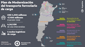 Renovación del San Martín Cargas, con una inversión de USD 2.604 millones, que comprende a 1.813 kilómetros de vías en las provincias de Mendoza, San Luis, Córdoba, Santa Fe y Buenos Aires. Proyecto corredores de carga a Vaca Muerta, con una inversión de USD 335 millones, que incluye la construcción de 118 kilómetros de rieles.