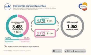 El Instituto Nacional de Estadística y Censos (INDEC) informó que en febrero las exportaciones alcanzaron USD 4.775 millones y las importaciones, 3.713 millones de dólares.