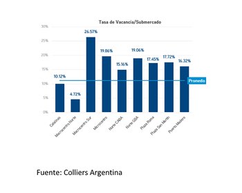 Las zonas más afectadas por el aumento de la vacancia, según Colliers, son Macrocentro Sur 26%, Microcentro 19% y Norte del Gran Buenos Aires 19%, mientras que por el contrario, en el Macrocentro Norte la oferta disponible es de menos del 5% del total.