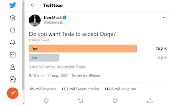 Musk, quien ha sido un partidario del Dogecoin, atrajo a 3.922.516 de encuestados en 24 horas da su consulta de Twitter sobre si Tesla debería comenzar a aceptar el token de Shiba Inu. ¿El resultado? Un 78,2% por el Sí, y un 21,8% por el No.