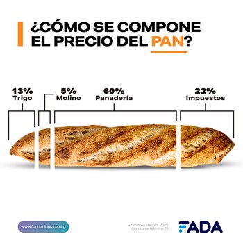 En la actualidad el kilo de pan se comercializa a 170 pesos y un kilo de trigo a $ 21,50. En ese sentido, se necesitan 1,25 kg de trigo para obtener 1 kg de harina, o sea que el trigo supone un costo de $ 27/kg de harina. Con un kg de harina se obtienen 1,25 kg de pan. O sea que la incidencia del trigo es de $ 21,5 por kg de pan.