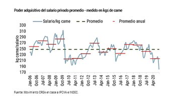 Según un informe del Consorcio Regional de Experimentación Agrícola (CREA), desde el comienzo de la crisis económica de 2018, que todavía continúa, el promedio del salario real privado descendió un 15% hasta la actualidad, misma proporción en que descendió el consumo de carne en dicho período.