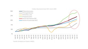 El índice de precios del productor (IPP) del Indec, que no contempla bienes importados, creció 5% en abril y acumula 22% en el año, una variación mayor incluso a la de los precios minoristas. Los mayores aumentos acumulados del IPP en el año se observan en plásticos (+53%), químicos (+40%), energía eléctrica (+36%) y petróleo crudo, refinado y gas (+35%).