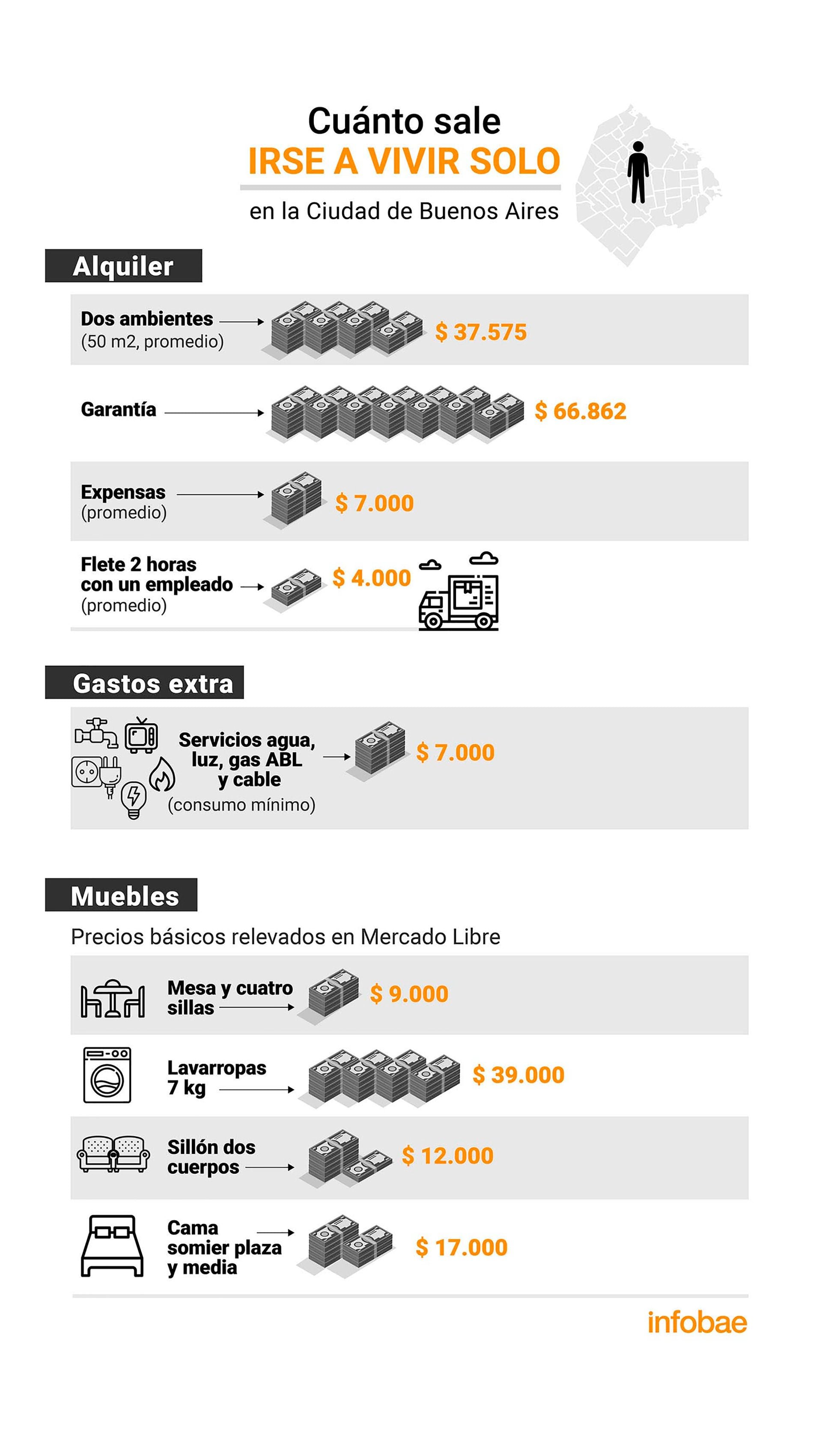 Según un cálculo realizado por Infobae, independizarse y mudarse a un departamento dos ambientes en la ciudad de Buenos Aires, considerando el precio del alquiler, el costo de la garantía, el depósito de reserva, expensas y un flete, puede costar desde $185.000, un 110% más que un año atrás cuando se hizo el mismo relevamiento.