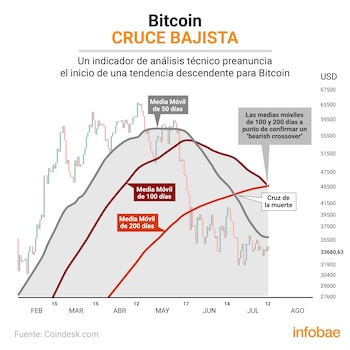 Los inversores en criptomonedas que recurren al “análisis técnico” para decidir sus estrategias e intentar predecir al mercado miran de cerca un nuevo indicador negativo que está a la vuelta de la esquina para Bitcoin. Se trata de un cruce bajista -bearish crossover- que se forma cuando se acelera la tendencia a la baja de un activo y que suele ser leído como el anticipo de más bajas por venir.