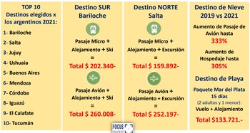También debe tenerse en cuenta que las opciones se redujeron respecto de 2019: salen del menú los destinos internacionales y para los locales la oferta aérea cae 50 % respecto de 2019, con precios 330 % más altos que hace dos años y, en el caso del alojamiento, con aumentos de hasta 305 % respecto de 2019, precisa el informe.