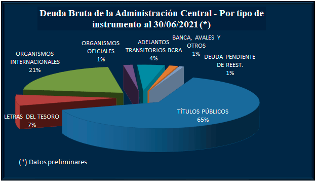 Del informe preliminar de la Secretaría de Finanzas surge que la deuda con organismos internacionales disminuyó en junio en USD 553 millones, a USD 70.556 millones (se desagrega en USD 45.520 millones con el FMI; USD 13.145 BID; USD 7.848 millones Banco Mundial; y USD 3.451 millones la Corporación Andina de Fomento -CAF-, principalmente).