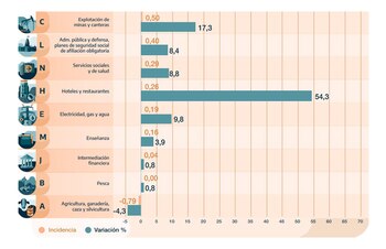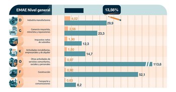 Otra manera de entender parte de los números pronunciados de incremento de actividad de todos esos rubros se ve a través de las caídas interanuales que tuvieron en mayo de 2020, lo que bajó la base de comparación. Hoteles y restaurantes se desplomó 72%, seguido por Otras actividades (-70%), Construcción (-50%), Industria manufacturera (-25%), Comercio (-21,4%) y Transporte y comunciaciones (-21,3 por ciento).