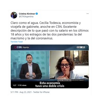 “Claro como el agua. Cecilia Todesca, economista y vicejefa de gabinete, anoche en C5N. Excelente descripción de lo que pasó con tu salario en los últimos 18 años y los estragos de las dos pandemias: la del macrismo y la del coronavirus”, expresó la vicepresidenta desde Twitter, donde publicó además el extracto de la entrevista.