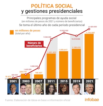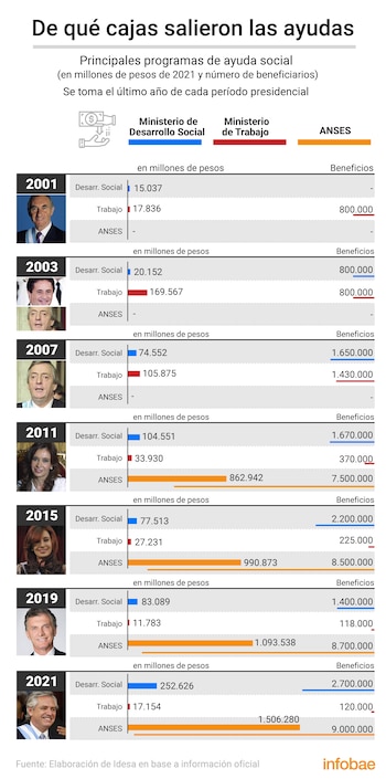 El relevamiento permite observar, en moneda constante (los montos están actualizados a millones de pesos de 2021) la evolución de los principales programas, tanto en valores monetarios como en número de beneficiarios (el experto prefiere usar el concepto de “beneficios”, pues una misma persona puede recibir más de uno), qué valores anuales dejó y recibió cada gestión presidencial. Como se puede ver en las infografías se toman los datos de “ayuda” que recibió cada mandatario y los que dejó al terminar su gestión, desde las cifras de 2001, último año de la presidencia de Fernando de la Rúa; pasando por las de 2003, un año compartido por las gestiones de Eduardo Duhalde y Néstor Kirchner; para luego precisar las cifras anuales de 2007, la “herencia” que en materia de ayuda social dejó Kirchner; luego el traspaso de Cristina Fernández Kirchner a sí misma en 2011 y el que en 2015 legó a Mauricio Macri, cuyo saldo, en 2019, fue el punto de partida de Alberto Fernández, con los números que su gestión de la ayuda social exhibe actualmente.