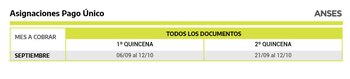 En tanto, las Asignaciones de Pago Único estarán disponibles para todas terminaciones de DNI desde el 6 de septiembre al 13 de octubre, y desde el 21 de septiembre al 12 de octubre para la segunda quincena.