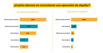 De acuerdo a la encuesta, el 68% de quienes sí lograron alquilar un nuevo inmueble dijo que demoró más de cuatro semanas en concretar la operación, mientras que a un 14% le llevó tres semanas y a un 8% menos de una semana.