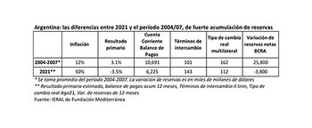 — Después de las elecciones de 2013 había en el Banco Central bastante más reservas netas que ahora (USD 17.000 millones vs USD 6.200 millones ahora -excluyo los DEG de la cuenta, porque antes de fin de año se habrán usado-), el déficit fiscal primario era, en términos del PBI, 1,2 puntos porcentuales inferior, pero el superávit comercial se había evaporado (USD 1.500 millones versus USD 12.000 millones en 2012). La devaluación de fin de 2013, principios de 2014, tuvo que ver con el agotamiento de los flujos vinculados al comercio exterior. En 2021 el superávit de la balanza comercial puede terminar en torno a USD 12.000 millones, pero este fenómeno es puro efecto mejora de los términos de intercambio (suben los precios de las exportaciones que los de las importaciones). Si uno mira volúmenes, los últimos datos muestran importaciones aumentando al 46% interanual y exportaciones al 7%, una brecha de 39 puntos porcentuales!!. Con precios internacionales de las materias primas relativamente estables de aquí en adelante, si la Argentina no recupera el acceso al crédito externo, más temprano que tarde en 2022 el Gobierno se enfrentará al dilema de quedarse sin reservas o frenar la actividad por no autorizar importaciones de insumos y partes.