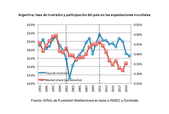 Visto al revés: en los últimos treinta años, la Argentina registra dos picos del nivel de la tasa de inversión como porcentaje del PBI; en 1998 se llegó a 21,1% del PBI y en 2011 a 21,61%. Ambos momentos coinciden con los de mayor penetración de las exportaciones del país en el mercado global, ya que en 1998 se alcanzó un market share de 0,49% de las exportaciones mundiales, mientras que en 2011 ese guarismo fue de 0,46 por ciento.