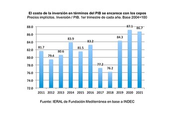 A su vez, si se aspira a recuperar la inversión, los cepos son una receta contraindicada desde el punto de vista de los precios relativos. En tres años, el costo de la inversión se ha encarecido en 10 puntos porcentuales en términos del PBI, mirando precios implícitos de las cuentas nacionales. Un índice ad-hoc que construimos en IERAL, en el que los precios de la inversión van en el numerador, y los del conjunto de la economía (PBI) van en el denominador, muestra que se pasó de 76,2 en el primer trimestre de 2018 a 86,7 en igual período de 2021. Algo parecido había ocurrido durante el “cepo original”, pero menos acentuado. Con los cepos, hace falta más PBI para agregar cada punto de nueva inversión.
