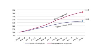 — Exactamente!!. Buen punto!!. Los datos de agosto del IPC mostraron cierta desaceleración de la inflación, pero la núcleo sigue arriba del 3 % mensual y hay percepción de transitoriedad de este fenómeno. Fijese lo que ocurre con el Indice de Precios Mayoristas, que en teoría tendría que variar en espejo a la variación del precio del dólar en el mercado oficial. Pues bien, en los últimos doce meses, mientras el tipo de cambio subió en términos nominales 34,8%, el IPIM aumentó 63%, una brecha de 28,2 puntos porcentuales!!. Existiendo restricciones para importar y sin horizonte claro acerca de la disponibilidad de divisas para el comercio exterior, el valor de reposición de los inventarios de las mercaderías que contienen insumos y partes importados empieza a escapar de la pauta del “dólar oficial”.