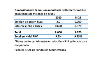 En el transcurso de este tercer trimestre, además, hay que tener en cuenta que la política fiscal y monetaria ha vuelto al patrón de 2020, luego de la “pausa” del primer semestre. ¿Cuánto más puede “forzarse la máquina”? La emisión de origen fiscal alcanzaría a $700.000 millones, y el pago de intereses por la deuda remunerada a $370.000 millones, cifras que sumadas equivalen a 9,9% del PBI de los 3 meses. En 2020, para el año calendario, esos guarismos fueron equivalentes a 9,6% del PBI.