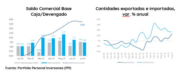 Para Portfolio Personal Inversiones, “la explicación puede estar orientada a que gran parte del fuerte superávit comercial del año ya fue liquidado en los meses previos. En los primeros siete meses del año, el superávit comercial cambiario (“base caja”) de USD 12.039 superó ampliamente al superávit comercial INDEC (“base devengado”) de USD 8.310 millones”, que deja diferencial entre ambas mediciones de USD 3.729 millones a julio.