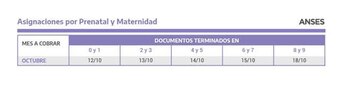 En tanto que la Asignación por Prenatal y Maternidad se pagará desde el martes 12 hasta el lunes 18 de octubre, de acuerdo a su terminación de DNI.