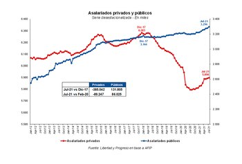 Según datos del Ministerio de Trabajo, desde que empezó la pandemia 89.247 asalariados privados perdieron su empleo, lo que representa una caída del 1,5% del empleo privado, mientras que se crearon 86.025 empleos públicos, marcando una suba del 2,7% en este sector.