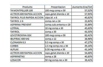En la lista de los que más subieron, también se encuentran el T4 Montpellier 100; el Actron 600 Rápida Acción cápsula blanda por 10 y por 20 comprimidos; el Clonagin 0.5 por 30 pastillas; y el Corbis de 2,5 mg por 30 comprimidos, entre otros.