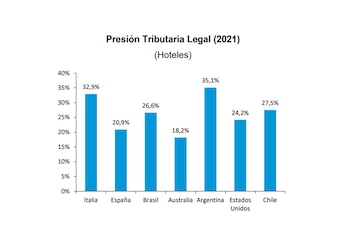 En la medición de la presión tributaria legal sobre empresas, en el caso de los servicios hoteleros, Argentina presenta la mayor presión tributaria legal con relación a las ventas, con un 35,1% de afectación, entre los siete países analizados, seguido por Italia (32,9% en Milán), Chile (27,3%), Brasil, Estados Unidos, España y Australia (17,9%).