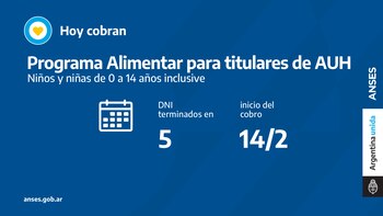 En el marco del Plan Argentina contra el Hambre del Ministerio de Desarrollo Social, ANSES acompaña con el pago del programa Alimentar. Hoy cobran titulares de AUH con documentos concluidos en 5 en la misma cuenta de la prestación.