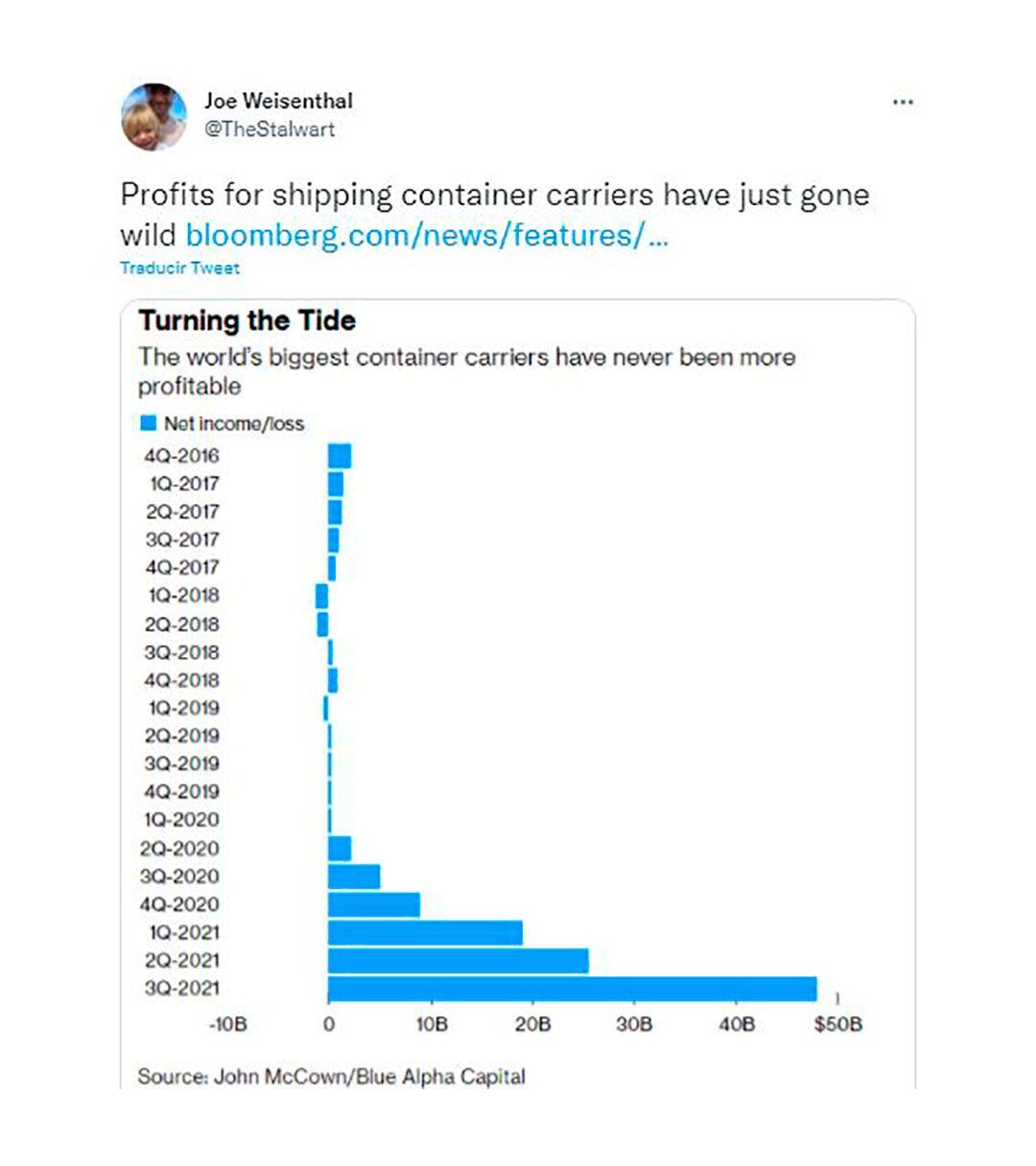 Lo que para importadores, exportadores y productores en general fue un gran dolor de cabeza, para las grandes navieras internacionales fue una gran oportunidad. Sus márgenes de ganancia treparon a niveles históricos, como mostró el tuit de un seguidor del sector (ver arriba), citando un informe de Bloomberg.