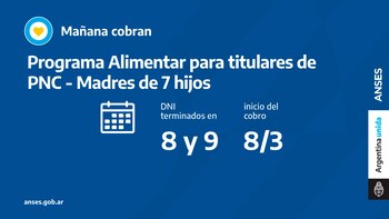 En el marco del Plan Argentina contra el Hambre del Ministerio de Desarrollo Social, Anses acompaña con el pago del programa Alimentar. Hoy cobran Madres de 7 hijos que perciben PNC con documentos finalizados en 8 y 9 en la misma cuenta de la prestación.