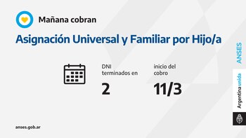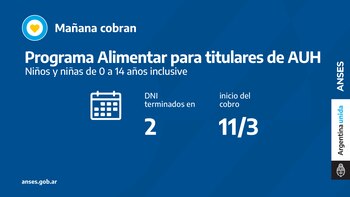 En el marco del Plan Argentina contra el Hambre del Ministerio de Desarrollo Social, Anses acompaña con el pago del programa Alimentar. Hoy cobran titulares de AUH con documentos terminados en 2 en la misma cuenta de la prestación.