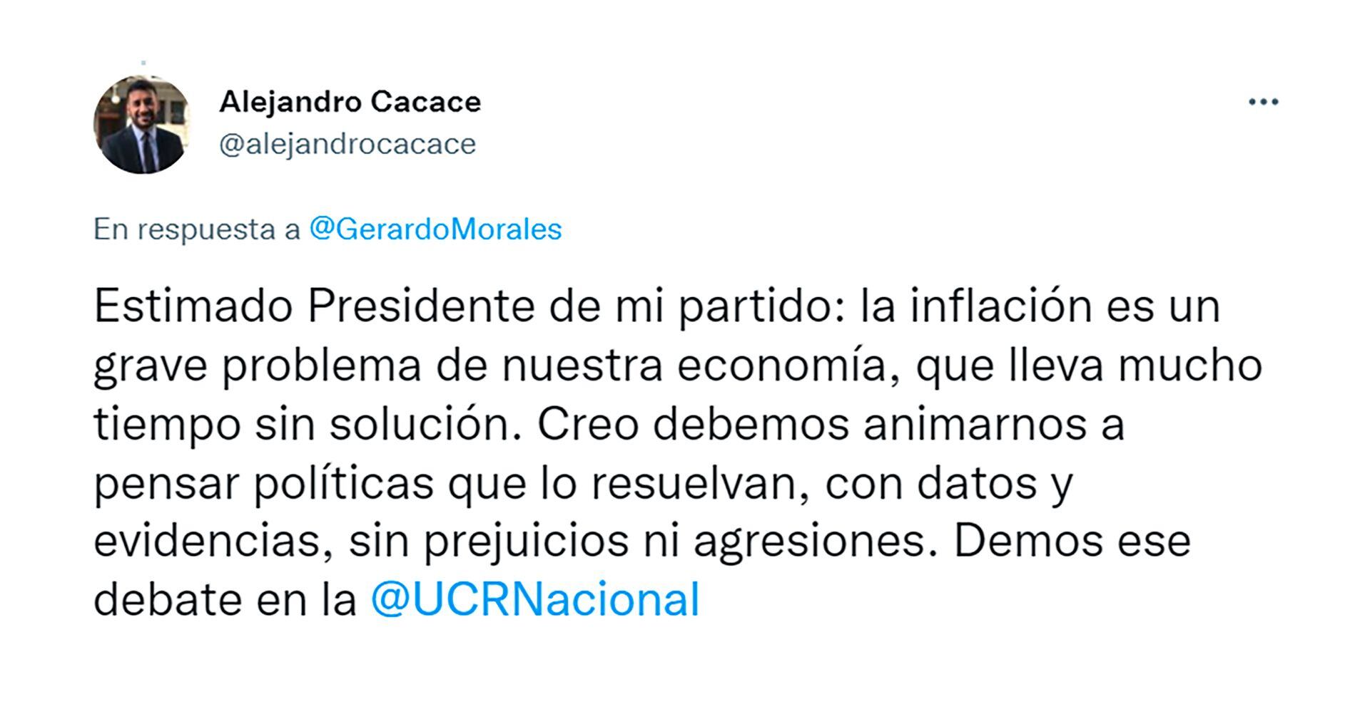 En ese marco, Cacace le respondió al gobernador por la misma vía: “Estimado Presidente de mi partido: la inflación es un grave problema de nuestra economía, que lleva mucho tiempo sin solución. Creo debemos animarnos a pensar políticas que lo resuelvan, con datos y evidencias, sin prejuicios ni agresiones. Demos ese debate en la @UCRNacional”, escribió el legislador en la red social del pajarito.
