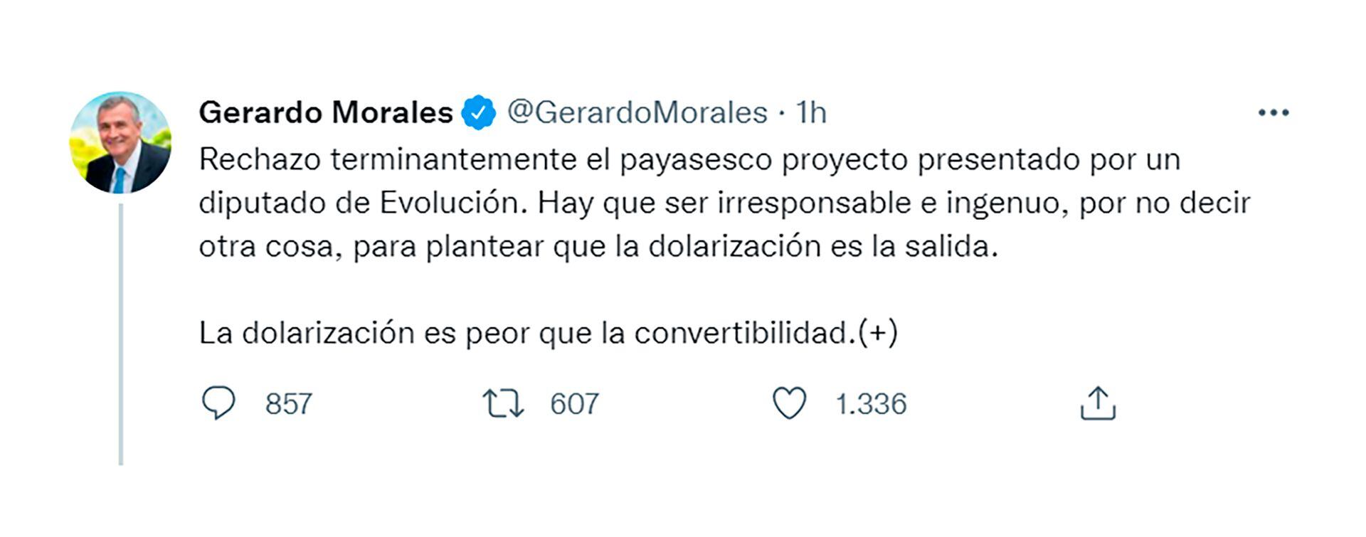 Luego de que el diputado nacional Alejandro Cacace presentara hoy un proyecto para dolarizar oficialmente la economía de la Argentina como herramienta para combatir la inflación, el gobernador de Jujuy y presidente de la UCR, Gerardo Morales, salió a cuestionar con dureza la iniciativa y en ese contexto afirmó: “Rechazo terminantemente el payasesco proyecto presentado por un diputado de Evolución”.