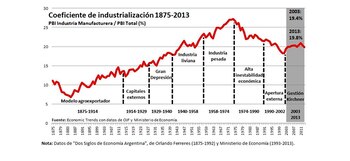 — Es interesante como en la Argentina se construyen “mitos” respecto a determinados temas para desalentar su debate y discusión pública. Algunos datos respecto a la industria Argentina: En 1875, es decir hace 147 años la industria representaba el 8% del producto bruto interno. En 1974, luego de 100 años dorados, se llega al máximo histórico de 27,4% del PBI. ¿Qué sucedió en los últimos 20 años? En 2003 se contrajo a 19,4% del PBI, y en 2019 bajó a 15,7%, y se recuperó parcialmente a 20,2% en 2021. Es decir, que la Argentina ha sufrido una desindustrialización dramática desde 1975 a la fecha, con distintas épocas de regímenes cambiarios y distintos tipos de cambio reales. El siguiente gráfico lo refleja con nitidez: