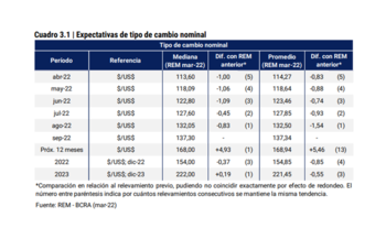 En abril se espera que el dólar siga creciendo por debajo de la inflación. “El pronóstico de quienes responden el REM indica una suba mensual de 3,8% hasta $113,60 por dólar en abril de 2022. La variación del tipo de cambio nominal prevista por las y los participantes del REM es de 51,1% i.a. para dic-22. Respecto de la encuesta previa, se evidenciaron correcciones a la baja en todos los meses. Para los próximos 12 meses (mar-23) se observó una corrección hasta $168,00 (+$4,93 por dólar)”, apuntó el informe.