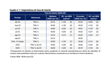 Atado a la suba de la inflación, los analistas esperan que el Banco Central responda con una moderada suba de tasas de interés. El REM los consulta sobre cuál será la tasa que pagarán los bancos privados por plazos fijos a 30 días superiores a $1 millón (Badlar) y las proyecciones también se corrigieron al alza. Para abril esperan una tasa Badlar de 42,76 (+2,2 p.p. por encima de marzo). Para diciembre se pronosticó una tasa de 44,5% (+2,5 p.p.). Cabe destacar que tras conocerse el IPC de marzo el próximo miércoles, el BCRA podría decidir una suba en la tasa de política monetaria, tal como ya hizo en tres oportunidades durante este año. Ese aumento llevaría hacia arriba todas las tasas del sistema.