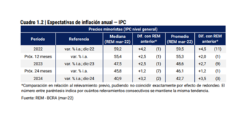 Las expectativas de suba de la inflación se dispararon con fuerza según el Relevamiento de Expectativas de Mercado (REM) de marzo publicado hoy por el Banco Central. Los analistas del mercado consultados pronosticaron que el Indice de Precios al Consumidor (IPC) aumentará un 59,2% en 2022, lo que implica una suba de 4,2 puntos porcentuales respecto de la encuesta del mes previo.