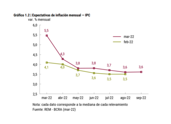 El pesimismo en los pronósticos para el alza de los precios, no obstante, no modificó una tendencia evidenciada en el informe anterior: el índice de marzo podría ser el pico inflacionario de 2022 y, a partir de allí, podría comenzar un paulatino descenso. El informe del BCRA explicó que si bien “se corrigieron al alza los valores de inflación esperados para todos los meses relevados”, los aumentos se desaceleran en los meses siguientes.