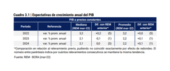 “Quienes participan del REM esperan un crecimiento del Producto Interno Bruto (PIB) real para 2022 de 3,2% (0,2 p.p. más respecto del REM previo). En cuanto a la variación trimestral desestacionalizada del PIB, la estimación para el primer trimestre de 2022 se corrigió hasta una suba estimada de 0,6% s.e., que resultó 0,1 p.p. inferior en relación con la encuesta previa. La estimación de crecimiento correspondiente al segundo trimestre de 2022 se redujo en 0,1 p.p. hasta una contracción de 0,4% s.e.”, puntualizó el informe.