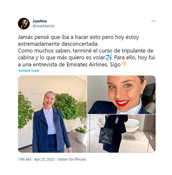 La joven azafata de 25 años relató que durante 2021 concluyó la capacitación para Tripulante de Cabina de Pasajeros (TCP), comúnmente conocido como azafata o sobrecargo, y que, a raíz de la pandemia y la falta de oportunidades, aún no había conseguido empleo en el rubro.