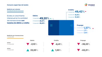 En conjunto, las transacciones con tarjetas de débito representaron el 49,20% del volumen de operaciones con credenciales en el primer trimestre de 2022 contra el 45,43% el primer trimestre de 2021, mientras que el volumen de dinero operado a través de las tarjetas de crédito pasó del 51,3% en el primer trimestre 2021 al 49,42% en el primer trimestre de 2022.