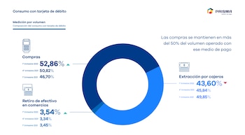 También aumentó el porcentaje de compras en el consumo con tarjeta de débito, que fue el 52,86% en el primer trimestre de 2022 contra el 46,70% en el mismo período de 2021, mientras que la extracción por cajeros se redujo del 49,85% al 43,60% entre primer trimestre de 2021 y 2022.