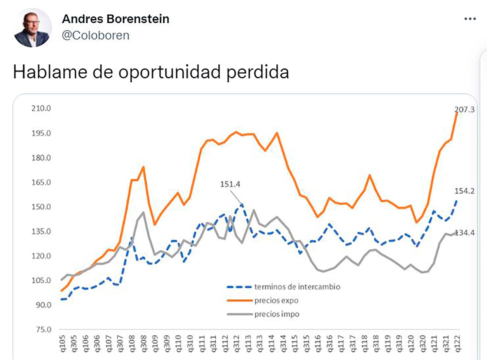 En cuanto al futuro inmediato, prima la incertidumbre sobre la disponibilidad de importaciones y de energía y un contexto internacional que -más allá de las explicaciones oficiales- hasta el primer trimestre favoreció al país (como evidenció el economista Andrés Borenstein en un tuit en el que graficó cómo la evolución de exportaciones, importaciones y “términos de intercambio” jugó para la Argentina), pero se complicará con la llegada del frío, por el costo de las importaciones de gas y probables faltantes de energía, el aumento de la tasa de interés en EEUU, que fortalecerá el dólar, contrarrestará el valor de las materias primas agrícolas y enfriará una economía mundial ya complicada por la invasión rusa y la guerra en Ucrania.