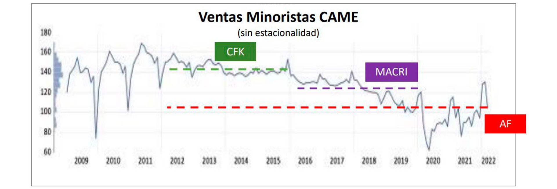 “El techo de generación de riqueza parecería haber caído estructuralmente a un nivel inferior al que existía en 2011/2018, cuando el nivel de actividad reptaba en torno a un nivel superior al que repta en 2018/2022. El actual nivel de actividad presenta una tendencia polinómica con forma de víbora, pero dentro de un marco de tendencia lineal descendente”, precisó en su último informe el economista Diego Giacomini. Ese reptar hacia abajo se refleja aún más claramente en la evolución de las ventas minoristas registradas por la Confederación Argentina de la Mediana Empresa (CAME).