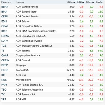 Dentro de ese panorama sombrío, los ADR y acciones argentinos que son operados en dólares en Nueva York cayeron arrastrados por la tendencia general. Mercado Libre perdió 10%, escoltado por Despegar (-6,3%) e YPF (-4,9%).