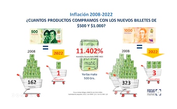 Mientras que con $500 en 2008 se podían adquirir 162 paquetes de yerba, en 2022 solo se puede comprar un paquete. Por otro lado en 2008 con $1.000 se podían pagar 323 paquetes de yerba, y hoy solo tres.
