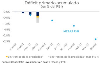 “Con casi todas las categorías de gasto corriendo por encima de la inflación y sin la ayuda extra de los ingresos captados por las rentas de la propiedad, es casi un hecho que el gobierno no podrá cumplir con la meta fiscal de 2,5% del PBI pactada con el FMI para este año. Incluso la meta fiscal de junio ya está bajo amenaza: si depuramos el resultado fiscal base caja de los primeros meses del año de los ingresos extras captados por las rentas de la propiedad y del costo fiscal del nuevo IFE, ya estaría incumplida. El gasto debería más que ajustarse, pero todo indica que hasta el momento no es algo que esté en los planes de la administración actual”, agregó Consultatio.
